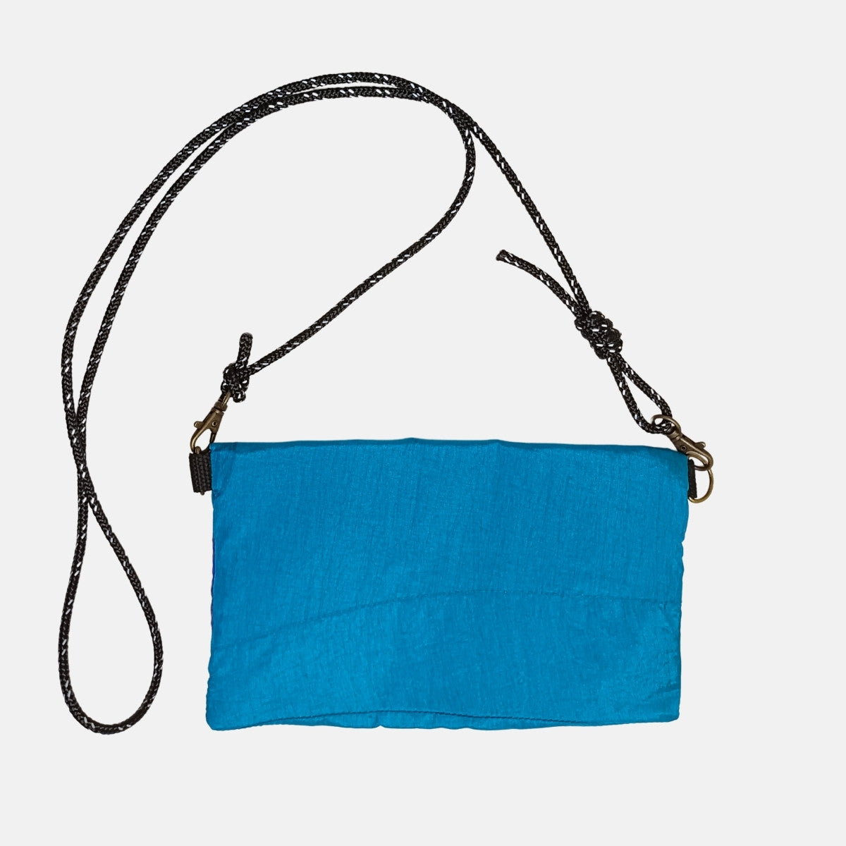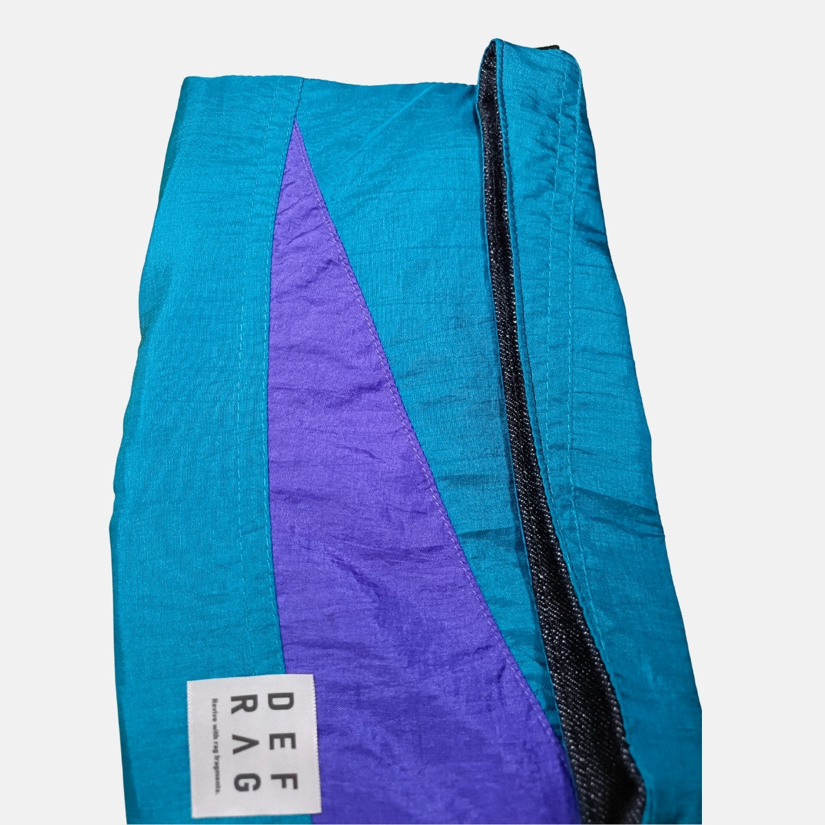 古着のナイロンジャケットを再構築したフラップショルダー。ブルー×パープルの斜め切り替えが爽やか。