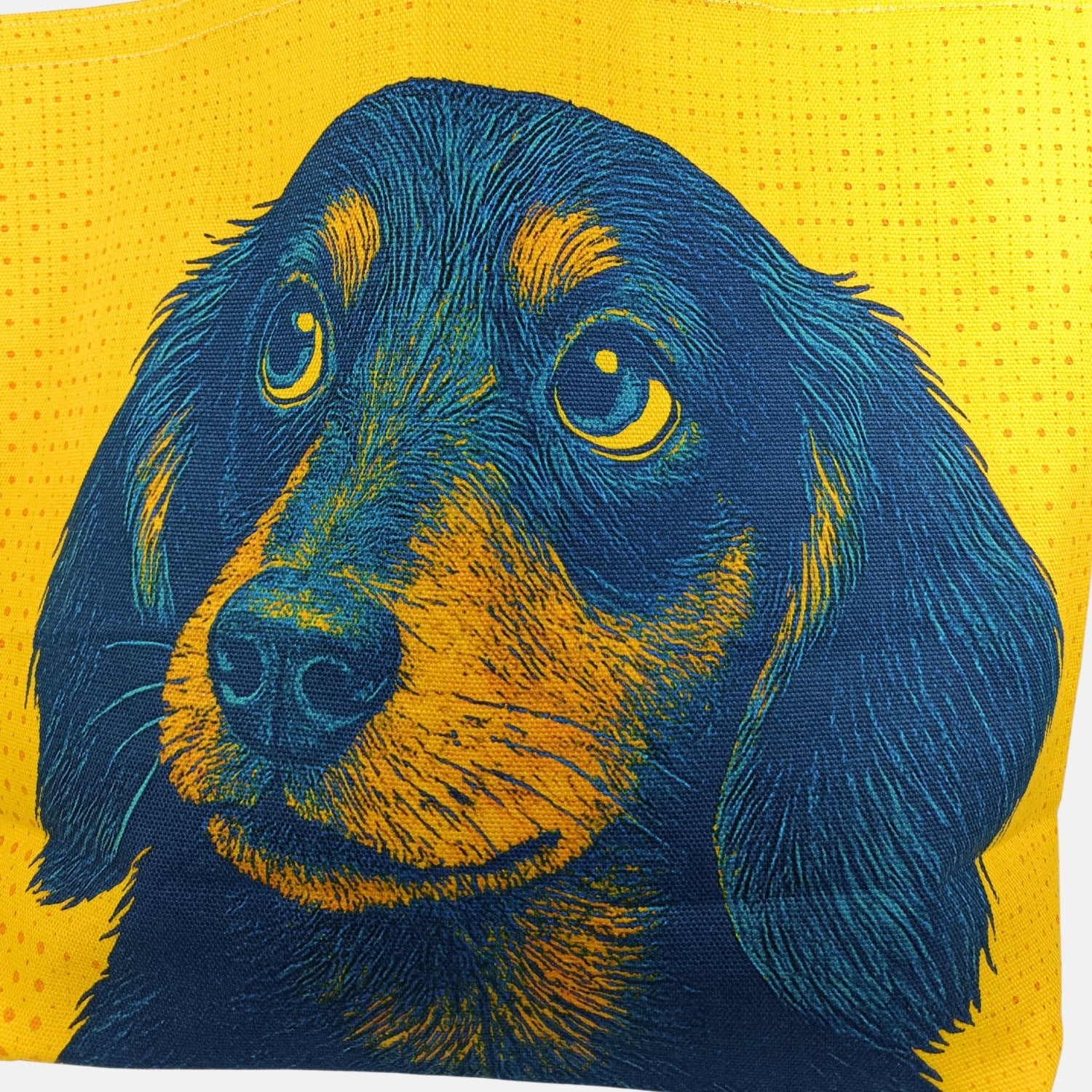 やわらかな眼差しのワンちゃんを大胆にプリントした、明るく楽しいアートトート。