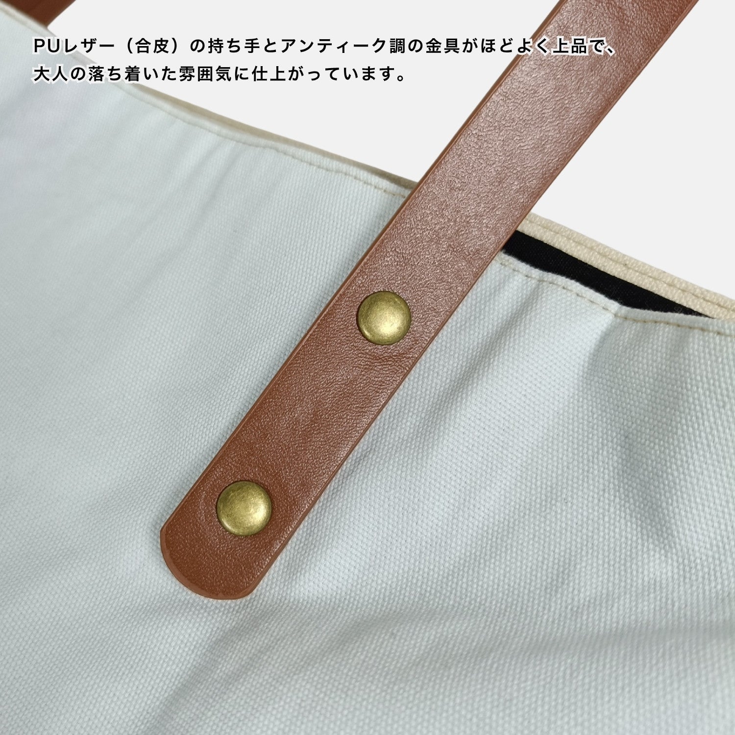 持ち手にはPUレザー(合皮)を使いアンティーク調の金具で固定。大人な雰囲気を演出しています。