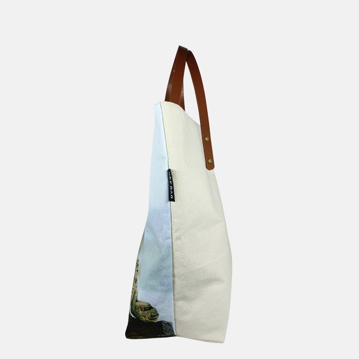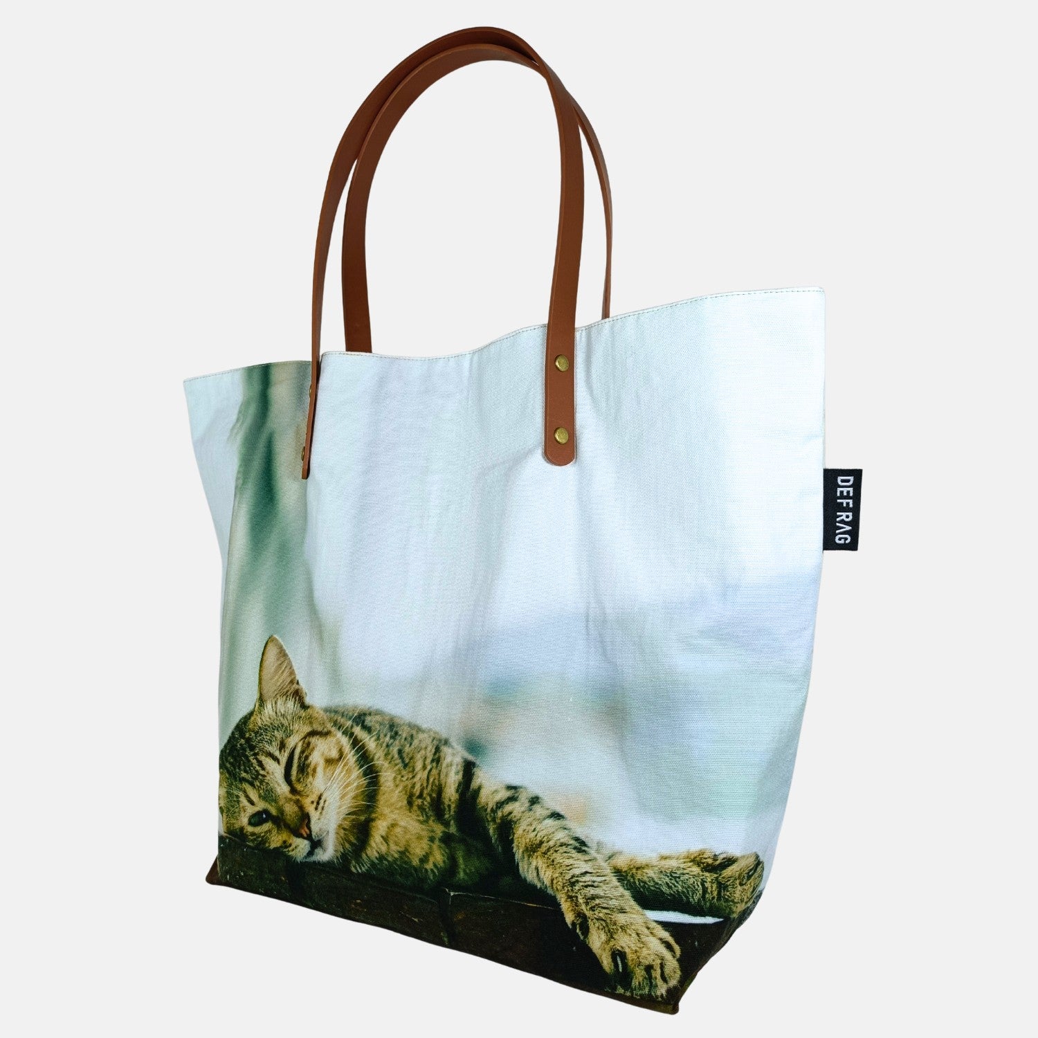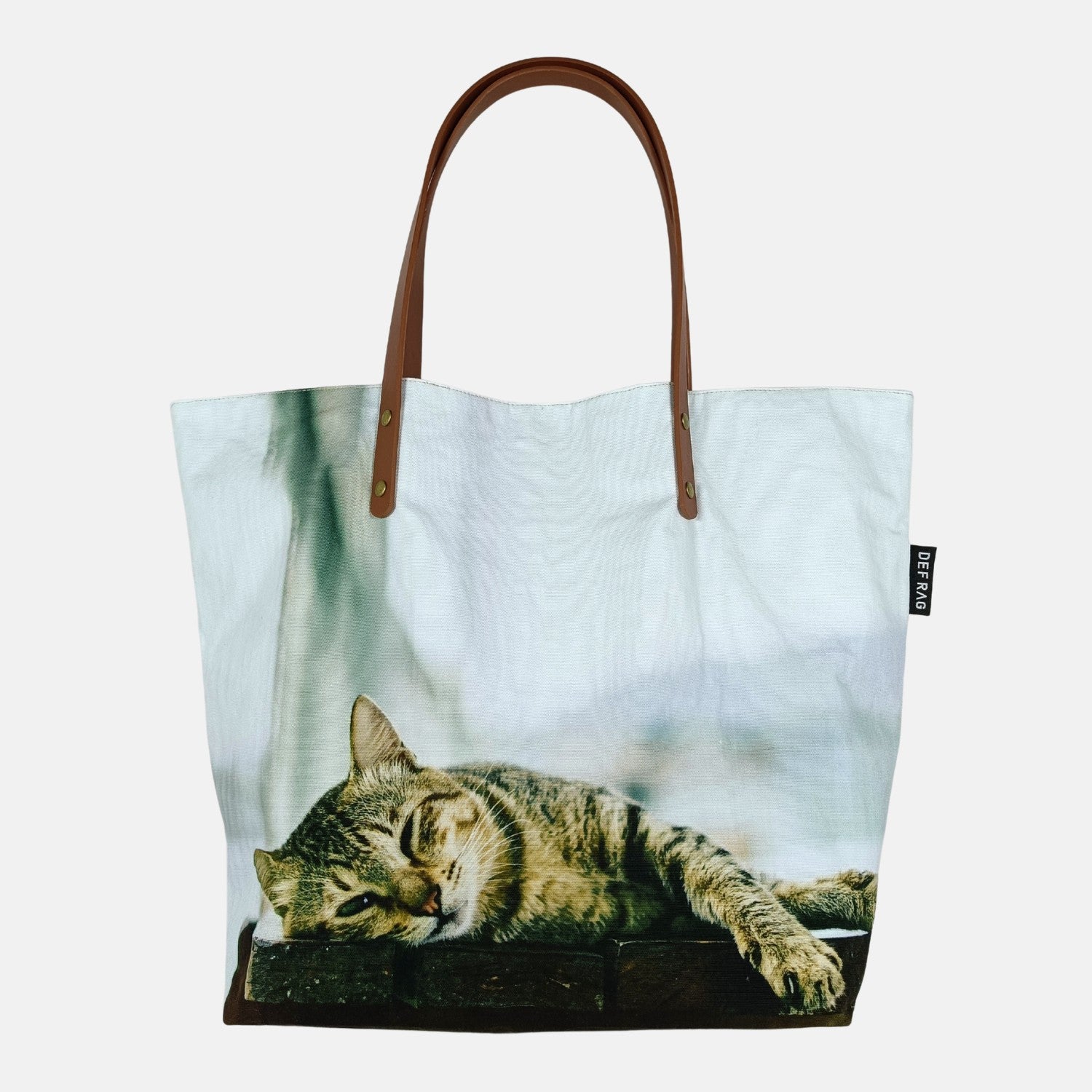なんだか惹かれる猫の写真を大胆にプリント。キャンバス・コットン素材ゆえの柔らかさやシワが独特の風合いをまとっています。
